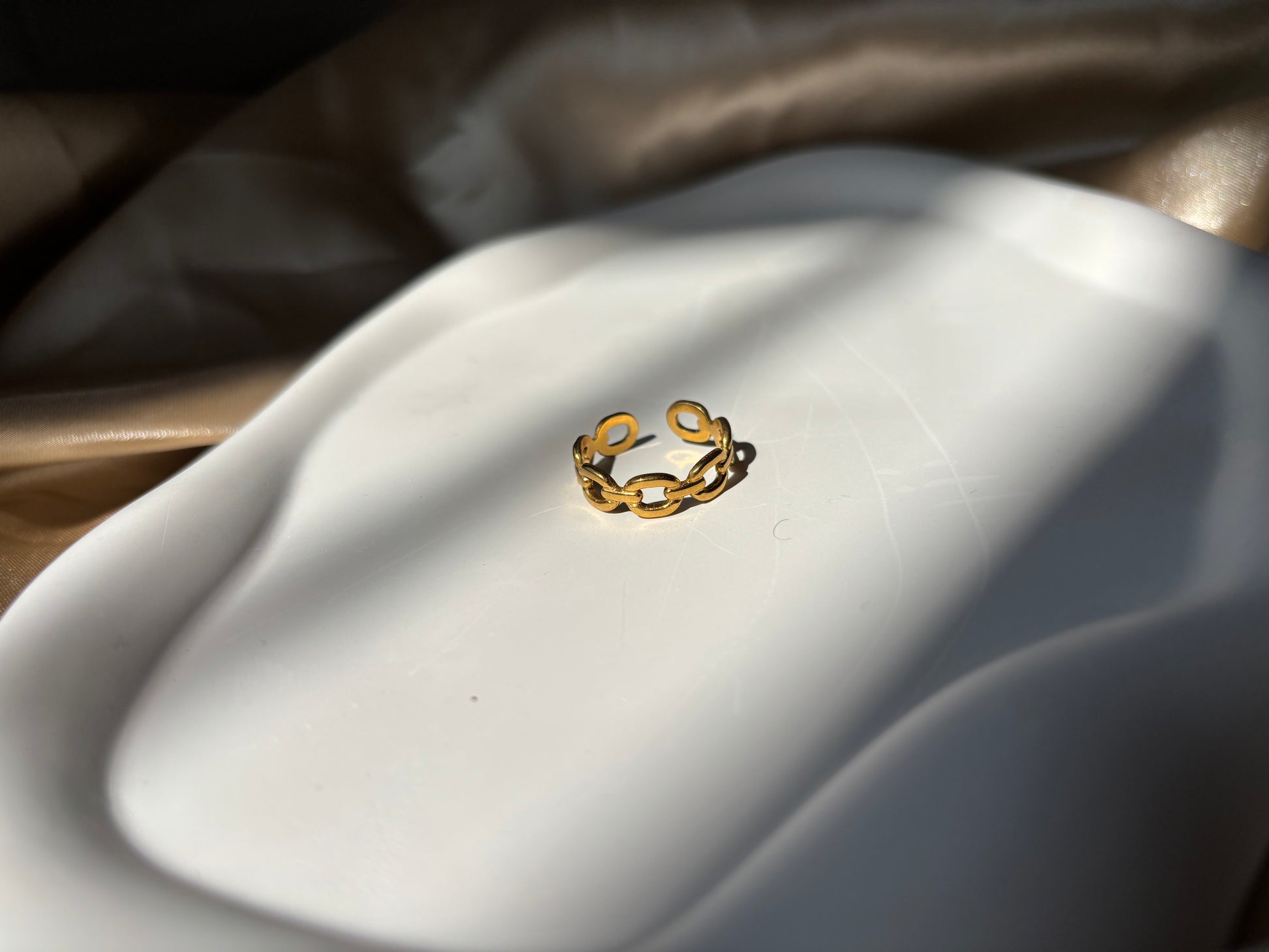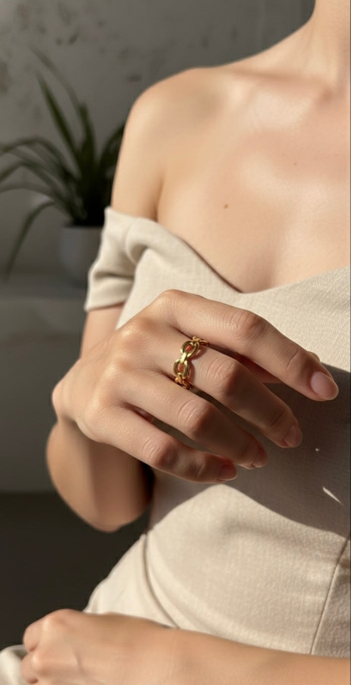 Ailaura Bold Link Ring features a modern chain-link design with a smooth gold finish, making it a strong yet stylish statement piece. The open design offers a comfortable, adjustable fit while adding a contemporary edge to your everyday look.