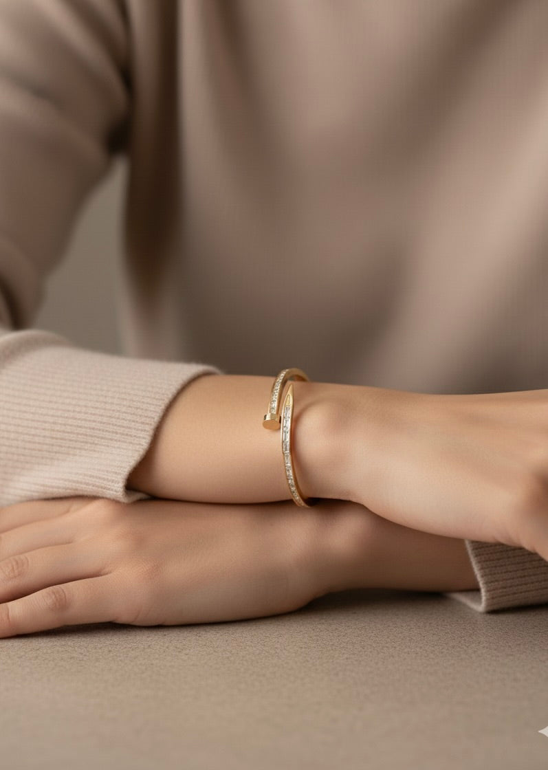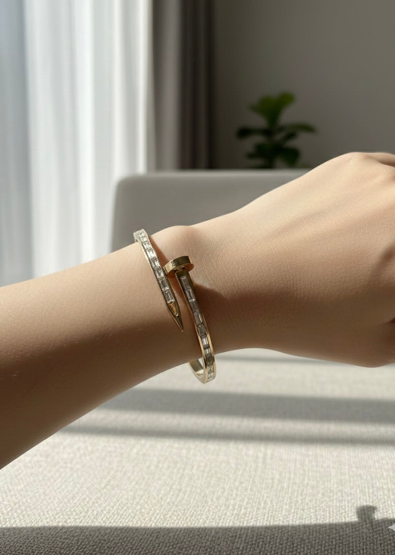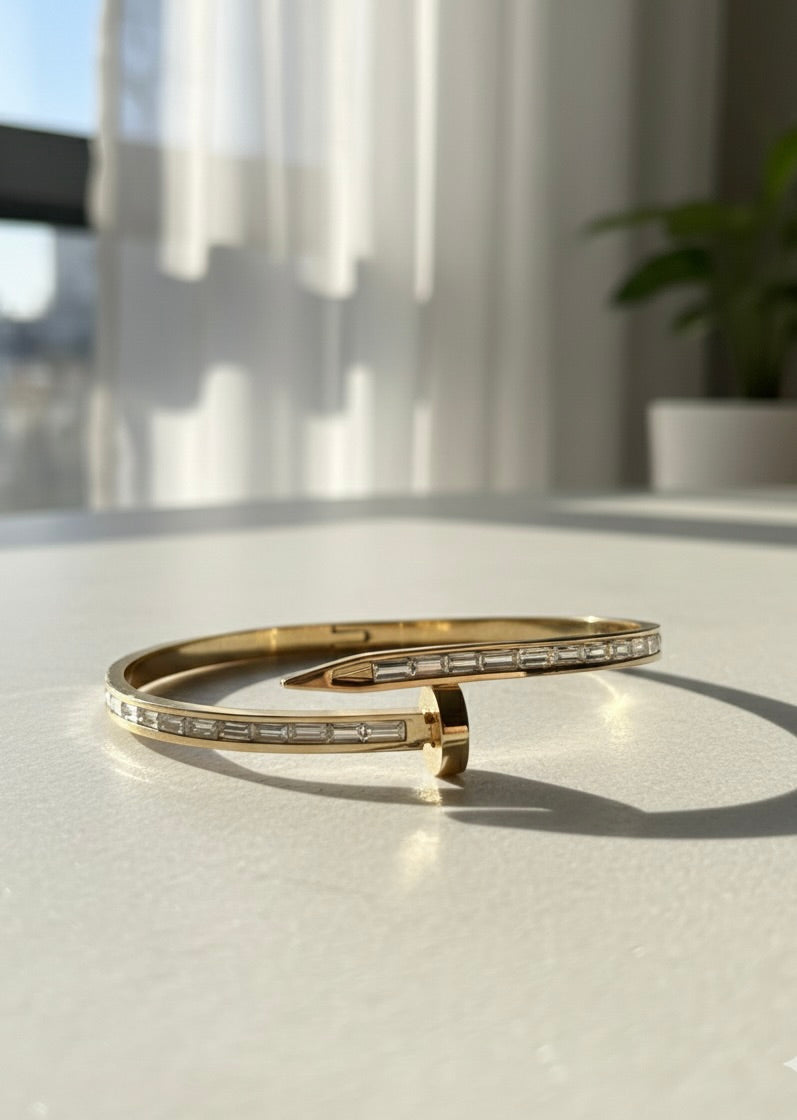 The Ailaura Éclat Crystal Cuff is a contemporary open bangle designed to make a subtle yet striking statement. Featuring clean architectural lines and precision-set baguette crystals, this piece reflects light with understated brilliance.