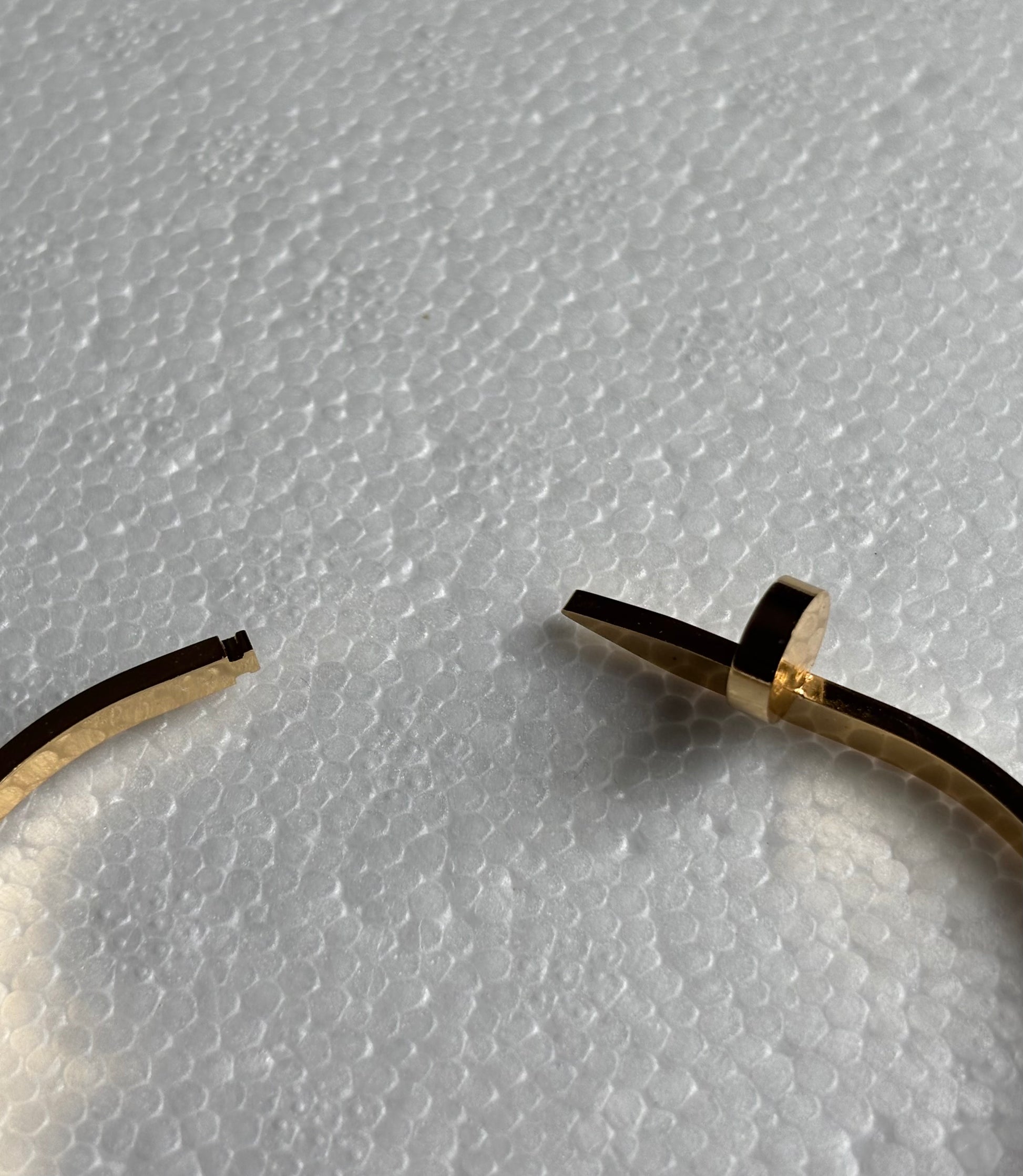 Its sleek open-cuff silhouette offers a comfortable fit while adding a modern edge to both everyday and evening looks. Finished with a demi-fine, anti-tarnish polish, this bracelet is designed for lasting shine and effortless sophistication.