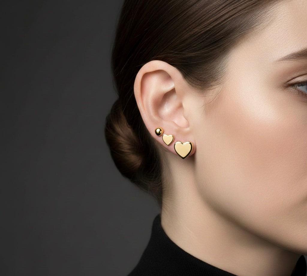 Ailaura Heart Stud Set is a set of 3 pairs of minimalist heart-shaped studs, designed for effortless everyday wear. With smooth, polished heart motifs in a classic gold finish, this set is perfect for mixing, matching, or wearing solo.