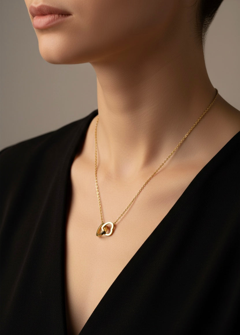 Minimal yet meaningful, the Ailaura Interlinked Rings Necklace features two delicately connected gold rings that symbolize connection, balance, and timeless elegance. Suspended on a fine chain, the pendant rests gracefully on the neckline, making it perfect for everyday wear or effortless layering.
