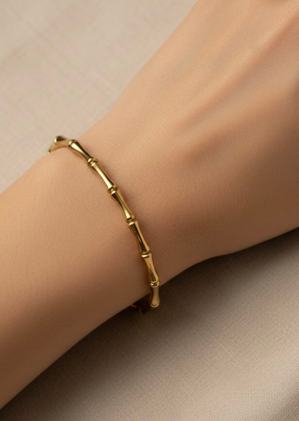 The Ailaura Solis Bamboo Bracelet features a sleek, segmented design inspired by natural bamboo forms. Its smooth, sculpted links create a refined silhouette that feels modern yet timeless.